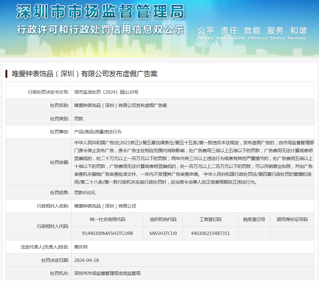 唯愛鐘表飾品(深圳)有限公司發布虛假廣告案