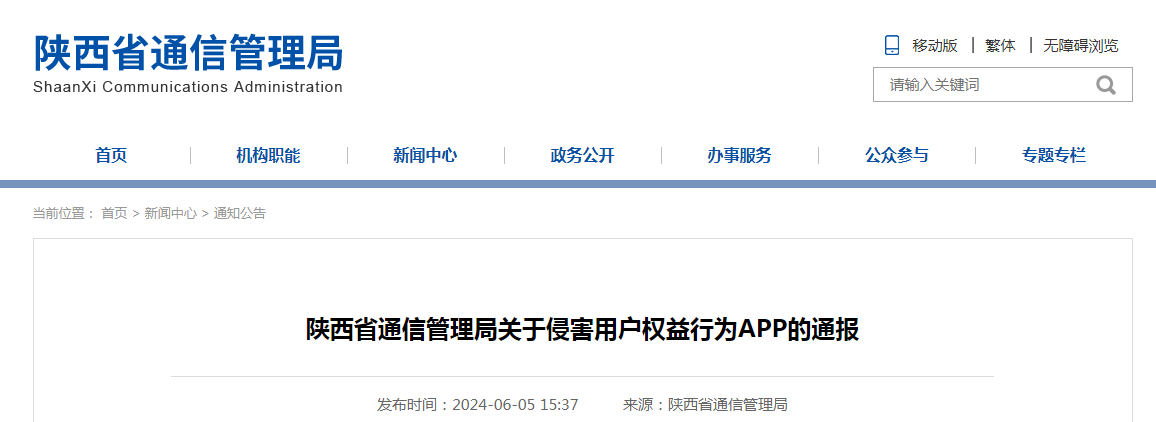 陜西省通信管理局關于侵害用戶權益行為APP的通報