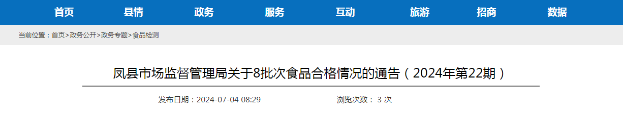 鳳縣市場監督管理局關于8批次食品合格情況的通告(2024年第22期)