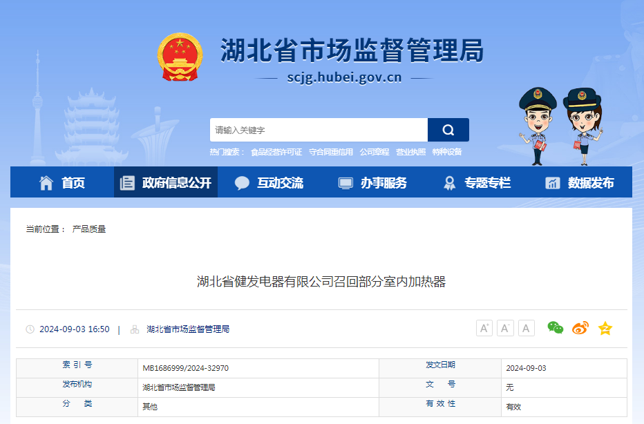 中國質量新聞網訊 據湖北省市場監管局網站消息,日前,湖北省健發電器有限公司按照《消費品召回管理暫行規定》的要求,主動向湖北省市場監督管理局備案了召回計劃,將自即日起,召回2023年3月10日生產的室內加熱器,型號:QFW-2901A,規格:220V 50Hz 900W,生產批號:20230310,涉及數量為20臺。