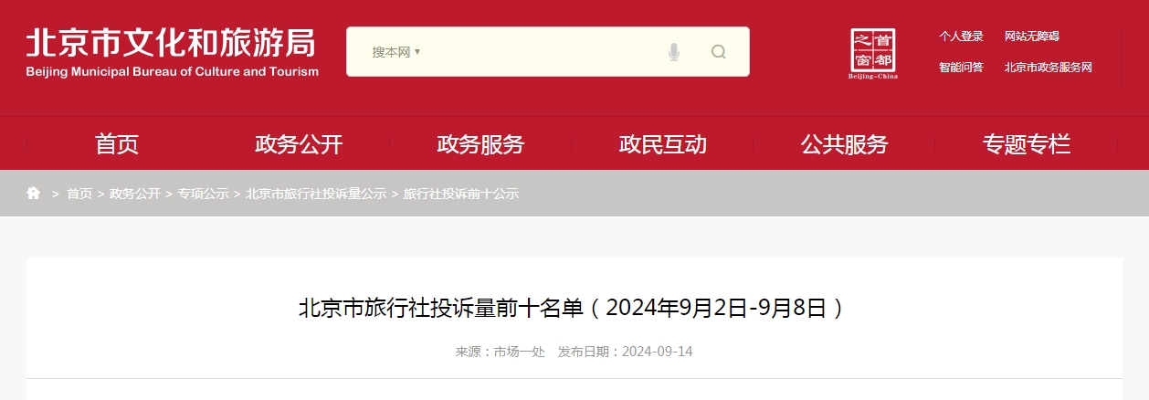 根據我市旅行社涉訴情況統計,現公布2024年9月2日至9月8日投訴量排名前十旅行社名單如下: