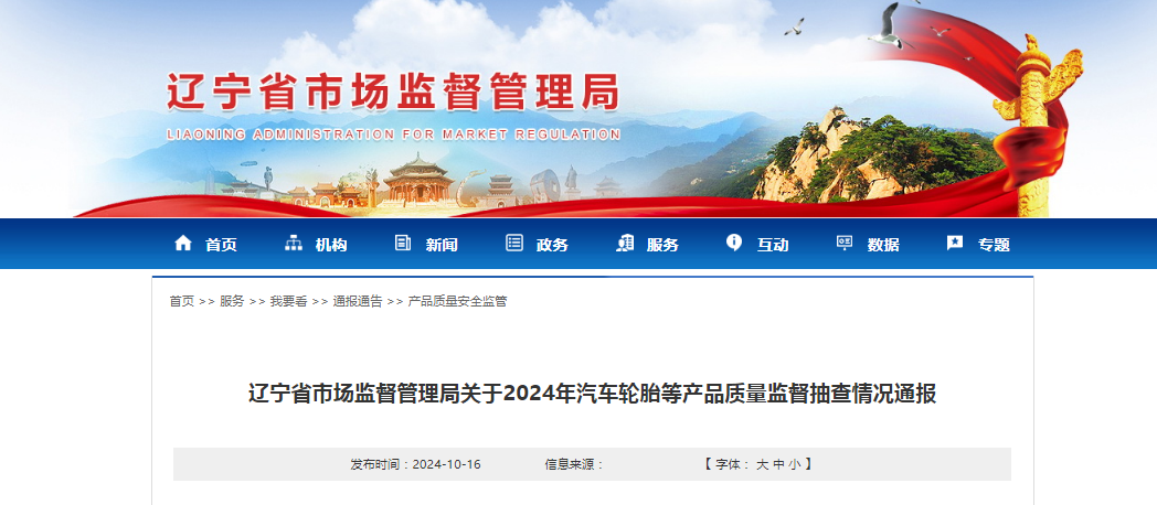 中國質(zhì)量新聞網(wǎng)訊 10月16日,遼寧省市場監(jiān)督管理局網(wǎng)站通報2024年汽車輪胎等產(chǎn)品質(zhì)量監(jiān)督抽查情況。