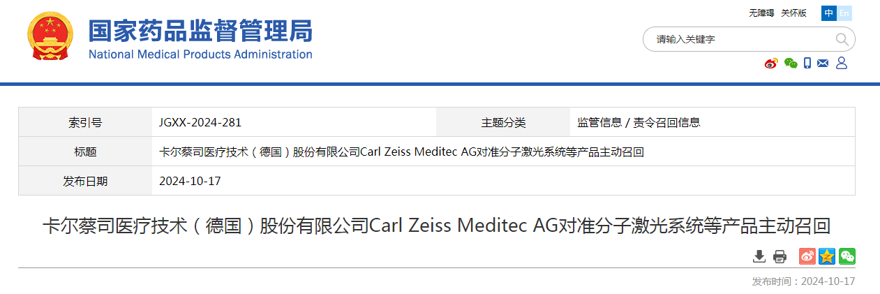 卡爾蔡司(上海)管理有限公司報(bào)告,由于搭載了尚未在日本批準(zhǔn)的功能PRK(激光屈光矯正角膜切除術(shù))以及PTK(治療性表層角膜切除術(shù))原因,生產(chǎn)商卡爾蔡司醫(yī)療技術(shù)(德國(guó))股份有限公司Carl Zeiss Meditec AG對(duì)其生產(chǎn)的準(zhǔn)分子激光系統(tǒng)Excimer Laser(國(guó)械注進(jìn)20153163346、國(guó)械注進(jìn)20153243346)主動(dòng)召回。召回級(jí)別為二級(jí)召回。本次召回涉及的產(chǎn)品未進(jìn)口至中國(guó),具體型號(hào)、規(guī)格及批次等詳細(xì)信息見(jiàn)《醫(yī)療器械召回事件報(bào)告表》。