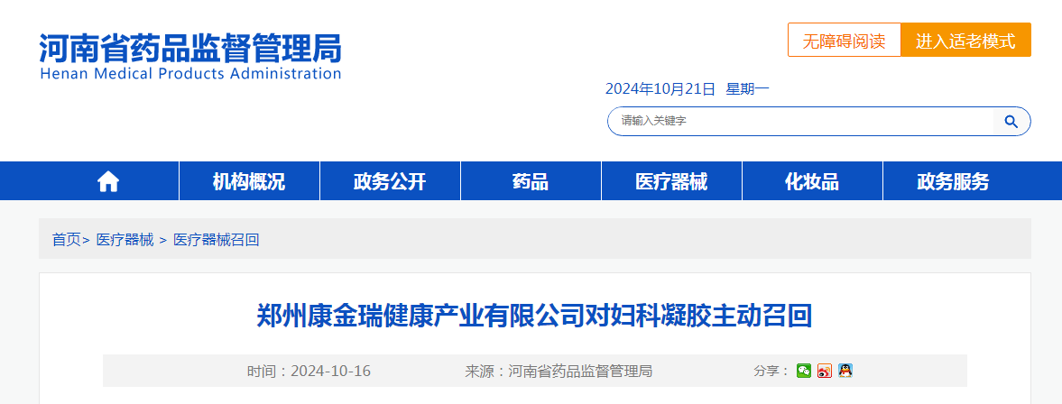 鄭州康金瑞健康產業有限公司報告,由于其生產的一批次婦科凝膠不符合規定,企業對其主動召回,召回級別為三級。召回產品的型號、規格及批次等詳細信息見《醫療器械召回事件報告表》。