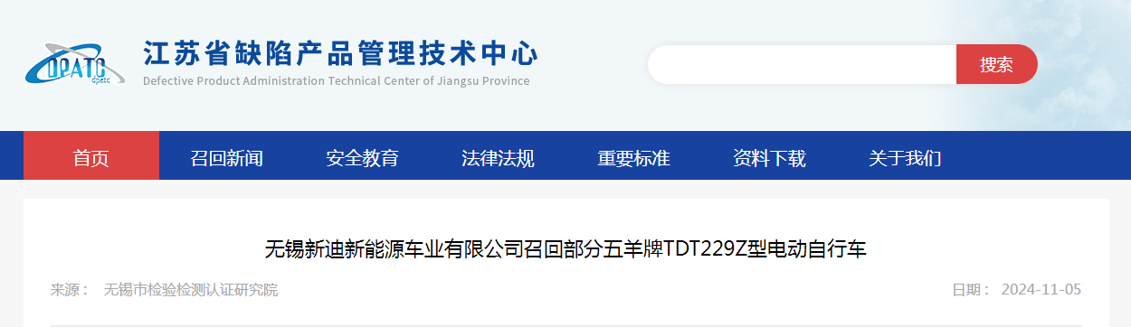 中國質量新聞網訊 據江蘇省缺陷產品管理技術中心網站消息,日前,無錫新迪新能源車業有限公司按照《消費品召回管理暫行規定》的要求,向無錫市市場監督管理局報告了召回計劃,將自即日起,召回2023年4月10日制造的五羊牌TDT229Z型電動自行車,涉及數量為168輛。