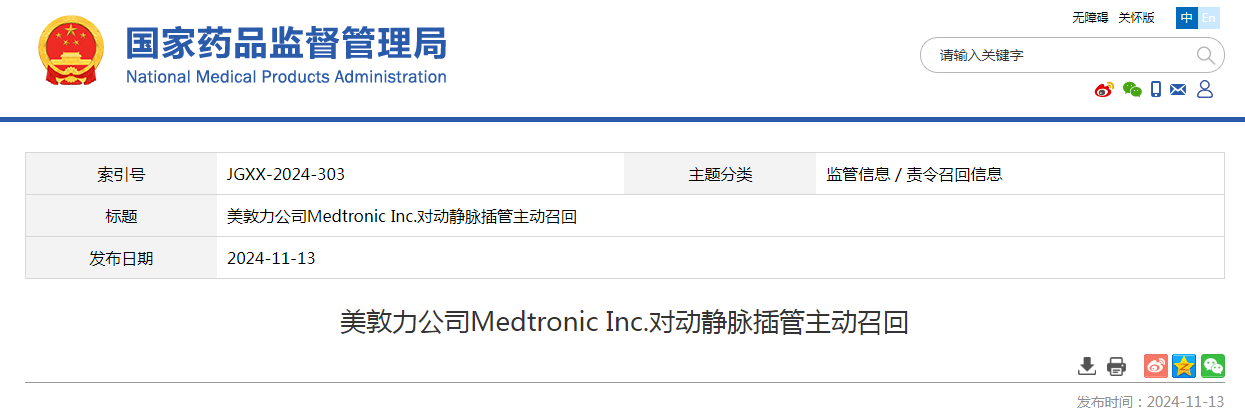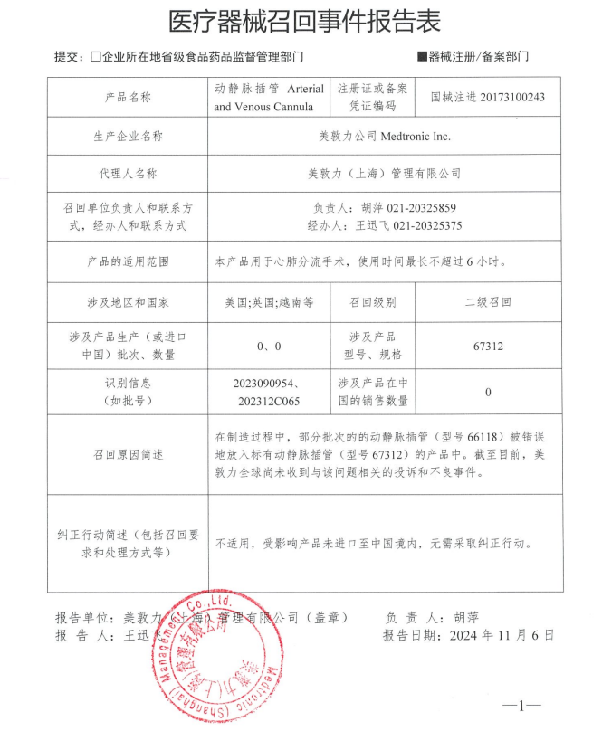 美敦力(上海)管理有限公司報告,由于產品錯誤組裝,生產商美敦力公司Medtronic Inc.對其生產的動靜脈插管Arterial and Venous Cannula(國械注進20173100243)主動召回。召回級別為二級召回。本次召回涉及的產品未進口至中國,具體型號、規格及批次等詳細信息見《醫療器械召回事件報告表》。