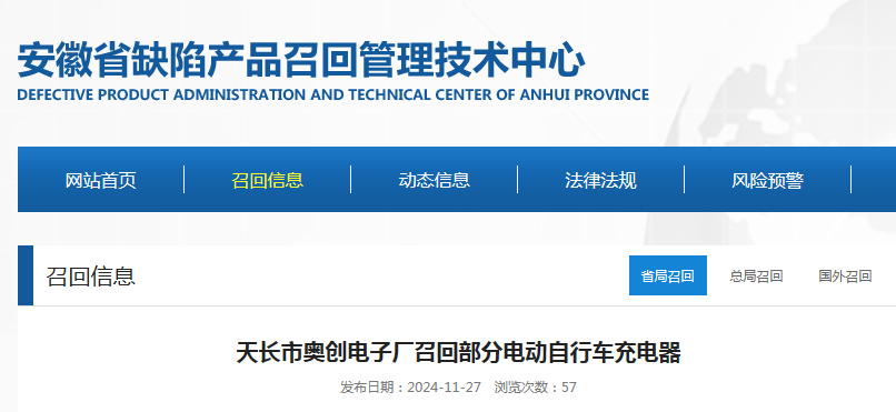 中國(guó)質(zhì)量新聞網(wǎng)訊 據(jù)安徽省缺陷產(chǎn)品召回管理技術(shù)中心網(wǎng)站消息,日前,天長(zhǎng)市奧創(chuàng)電子廠按照《消費(fèi)品召回管理暫行規(guī)定》的要求,向安徽省市場(chǎng)監(jiān)督管理局、滁州市市場(chǎng)監(jiān)督管理局報(bào)告了召回計(jì)劃,將自即日起,召回2023年6月10日生產(chǎn)的48V20Ah電動(dòng)自行車(chē)充電器,涉及數(shù)量為1500只。