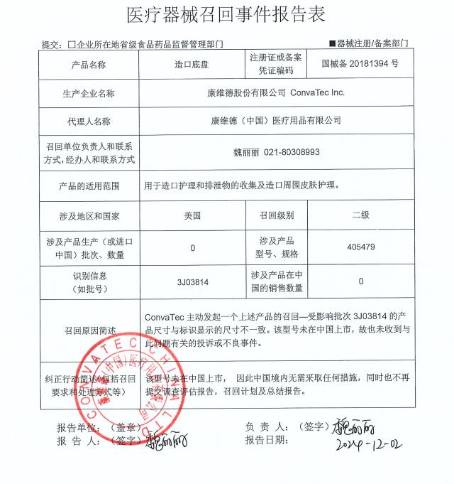 康維德(中國(guó))醫(yī)療用品有限公司報(bào)告,由于標(biāo)識(shí)尺寸與產(chǎn)品實(shí)際尺寸不一致的原因,生產(chǎn)商康維德股份有限公司 ConvaTec Inc.對(duì)其生產(chǎn)的造口底盤(pán) Esteem Synergy Skin Barrier (國(guó)械備20181394號(hào))主動(dòng)召回。召回級(jí)別為二級(jí)召回。本次召回涉及的產(chǎn)品未進(jìn)口至中國(guó),具體型號(hào)、規(guī)格及批次等詳細(xì)信息見(jiàn)《醫(yī)療器械召回事件報(bào)告表》。