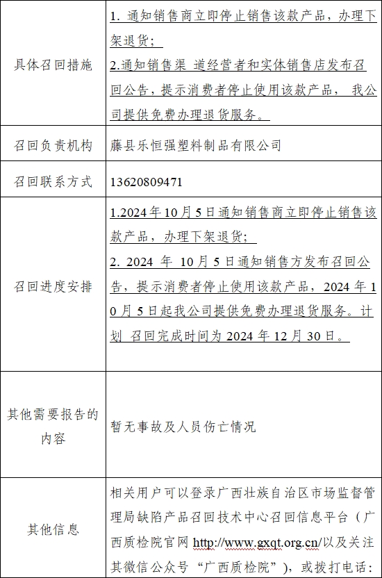 中國質(zhì)量新聞網(wǎng)訊 日前,藤縣樂恒強塑料制品有限公司受缺陷調(diào)查影響,按照《消費品召回管理暫行規(guī)定》的要求,主動向廣西壯族自治區(qū)市場監(jiān)督管理局報告了召回計劃,將自即日起,召回2024年1月20日生產(chǎn)的部分“樂恒強”品牌摩托車乘員頭盔產(chǎn)品,規(guī)格為339 A3,生產(chǎn)日期/批號為2024.1.20/202400100,涉及數(shù)量為38個。