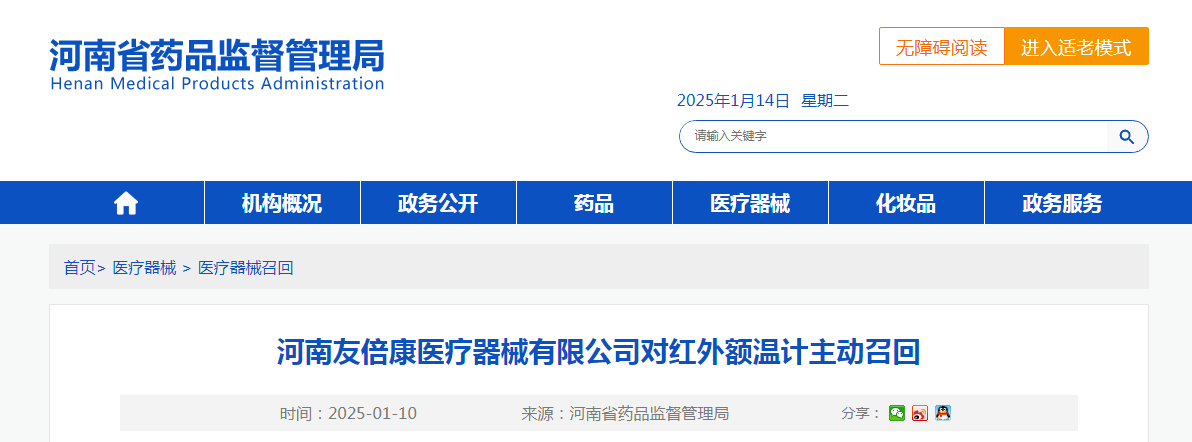 河南友倍康醫療器械有限公司報告,由于其生產的兩批次紅外額溫計不符合規定,企業對其主動召回,召回級別為三級。召回產品的型號、規格及批次等詳細信息見《醫療器械召回事件報告表》。