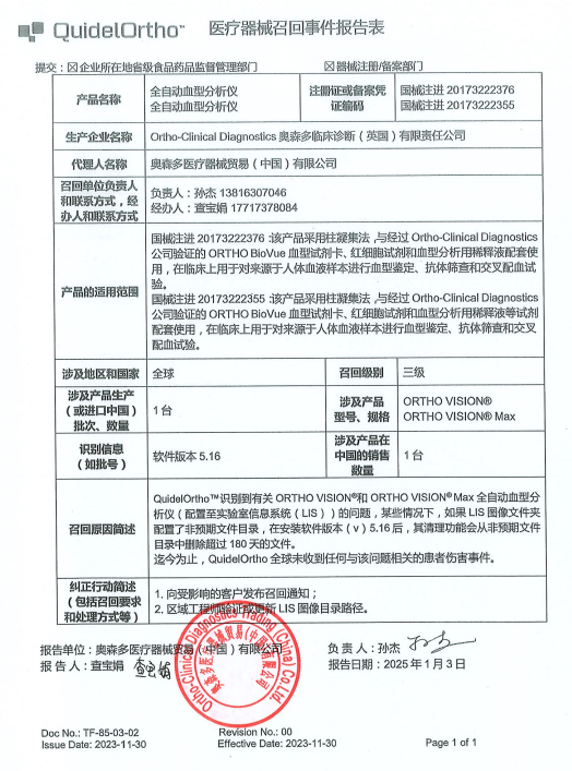 奧森多醫療器械貿易(中國)有限公司報告,QuidelOrtho?識別到有關ORTHO VISION?和ORTHO VISION? Max全自動血型分析儀(配置至實驗室信息系統(LIS))的問題,某些情況下,如果LIS圖像文件夾配置了非預期文件目錄,在安裝軟件版本(v)5.16后,其清理功能會從非預期文件目錄中刪除超過180天的文件。由于上述問題,奧森多醫療器械貿易(中國)有限公司對其生產的全自動血型分析儀;全自動血型分析儀(注冊證號:國械注進20173222376;國械注進20173222355)主動召回。召回級別為三級。涉及產品的型號、規格及批次等詳細信息見《醫療器械召回事件報告表》。