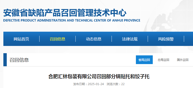 中國質量新聞網訊 據安徽省缺陷產品召回管理技術中心網站消息, 日前,合肥匯林包裝有限公司按照《消費品召回管理暫行規定》的要求,向安徽省市場監督管理局、合肥市市場監督管理局報告了召回計劃,將自即日起,召回2024年8月27日生產的鍋貼托(330*205*43mm,12個裝/盒)和餃子托(330*205*43mm,15個裝/盒),涉及數量為鍋貼托400盒和餃子托320盒,共計720盒。