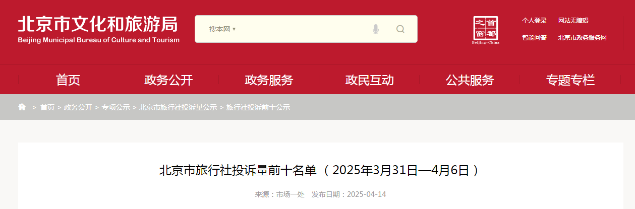 北京市旅行社投訴量前十名單 (2025年3月31日—4月6日)