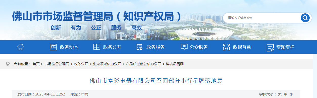 中國質量新聞網訊 據廣東省佛山市市場監管局網站消息,日前,佛山市富彩電器有限公司按照《消費品召回管理暫行規定》的要求,主動向佛山市市場監督管理局報告了召回計劃,將自即日起,召回2022年4月2日至2022年4月3日期間制造的部分小行星牌型號FS-45A落地扇,涉及數量為10個。