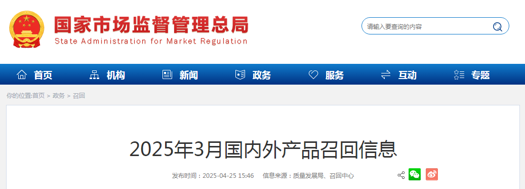 2025年3月國內(nèi)外產(chǎn)品召回信息