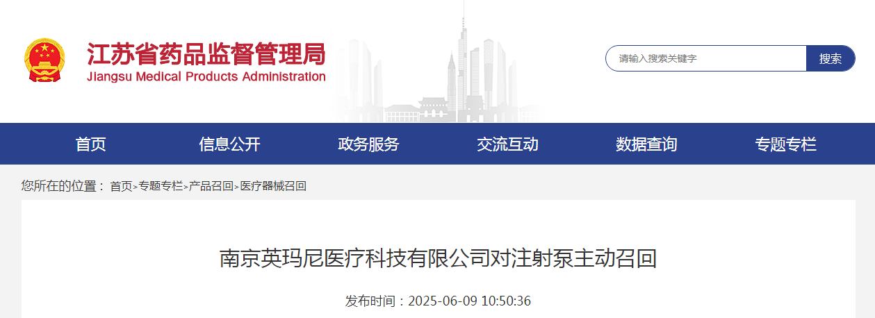 南京英瑪尼醫療科技有限公司報告,由于在國家監督抽檢中出現報警音音量不符合國標要求的原因,南京英瑪尼醫療科技有限公司對其生產的注射泵主動召回。召回級別為三級。涉及產品的型號、規格及批次等詳細信息見《醫療器械召回事件報告表》。