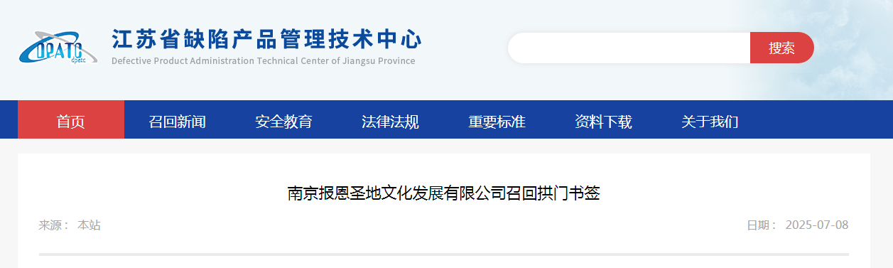 中國質量新聞網訊 據江蘇省缺陷產品管理技術中心網站消息,日前,南京報恩圣地文化發展有限公司按照《消費品召回管理暫行規定》《江蘇省缺陷消費品召回管理辦法》的要求,主動向江蘇省市場監督管理局報告了召回計劃,將自即日起,召回2023年6月30日至2023年7月14日期間制造的拱門書簽,涉及數量為687個。