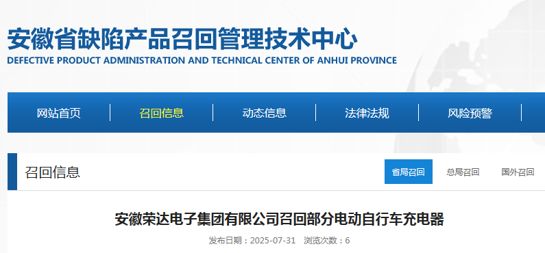 中國質量新聞網訊 據安徽省缺陷產品召回管理技術中心網站消息,日前,安徽榮達電子集團有限公司按照《消費品召回管理暫行規定》的要求,向安徽省市場監督管理局、滁州市市場監督管理局報告了召回計劃,將自即日起,召回2023年6月生產的電動自行車充電器1500只(規格型號:DZM 48V12A)和2023年2月生產的電動自行車充電器1200只(規格型號:DZM 48V20A),共計2700只。