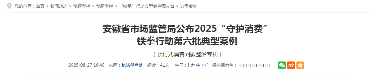 安徽省市場監(jiān)管局公布2025“守護消費”鐵拳行動第六批典型案例(預(yù)付式消費問題整治專刊)