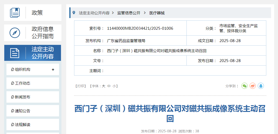 西門子(深圳)磁共振有限公司生產的磁共振成像系統,生產批號見附件,因西門子醫療發現上述涉及產品在未嚴格按照正常操作與維護規程的前提下,排氣系統可能出現潛在問題:在磁體失超的情況下,制冷劑氣體存在排入磁共振掃描室的微小可能性,若通風不足,可能導致安全隱患。本次主動召回本質上是為排除偶發風險并持續保障患者和操作人員安全而實施的預防性檢查。因此決定對售出產品實施召回,召回級別為二級。