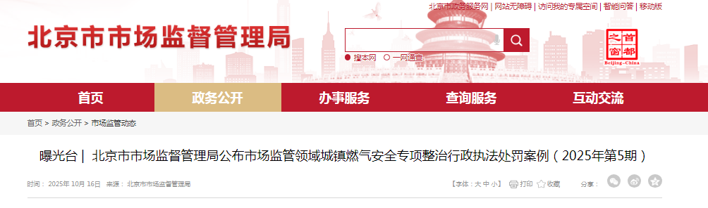 曝光臺 | 北京市市場監督管理局公布市場監管領域城鎮燃氣安全專項整治行政執法處罰案例(2025年第5期)
