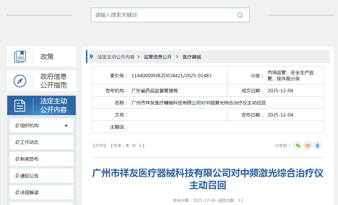 廣州市祥友醫療器械科技有限公司對中頻激光綜合治療儀主動召回