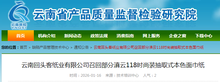 中國質量新聞網訊 據云南省產品質量監督檢驗研究院網站消息,日前,云南回頭客紙業有限公司按照《消費品召回管理暫行規定》的要求,主動向云南省市場監督管理局報告了召回計劃,將自即日起,召回2025年02月17日生產的部分滇云118時尚裝抽取式本色面巾紙,型號/規格為118mmx180mmx240張,10包/提,涉及數量為250提。