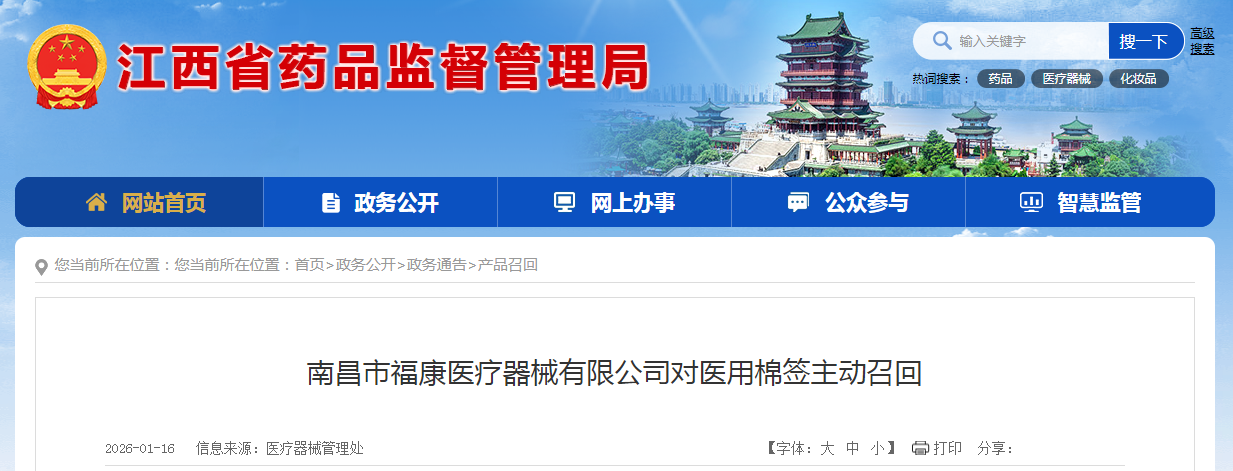 南昌市福康醫療器械有限公司報告,由于我公司于2025年12月29日收到貴局發出的由江西省醫療器械檢測中心出具的關于產品醫用棉簽(贛械注準20162140132)的不合格品檢測報告(報告編號:YacY20250013-PX)。等原因,南昌市福康醫療器械有限公司對其生產的醫用棉簽(注冊備案號:贛械注準20162140132)主動召回,召回級別為三級,涉及產品的型號、規格及批次等詳細信息見《醫療器械召回事件報告表》。