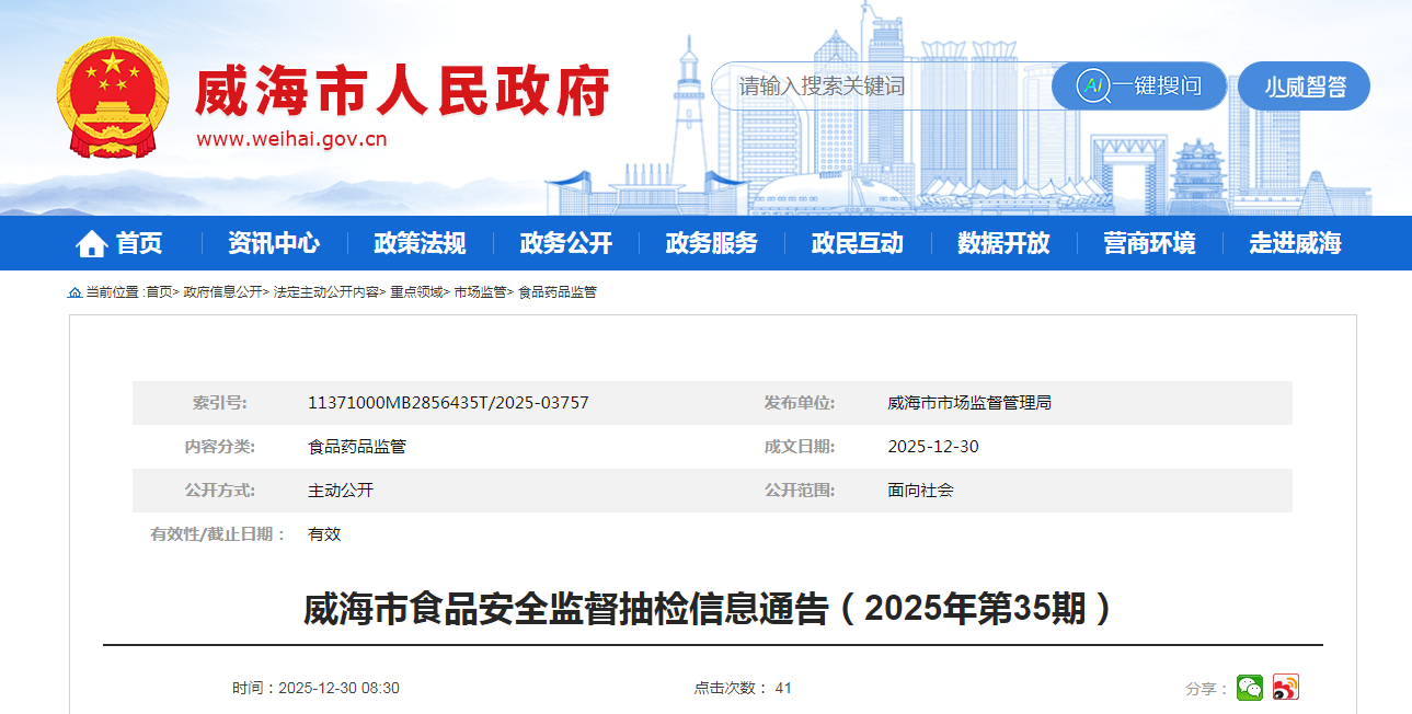 威海市食品安全監督抽檢信息通告(2025年第35期)