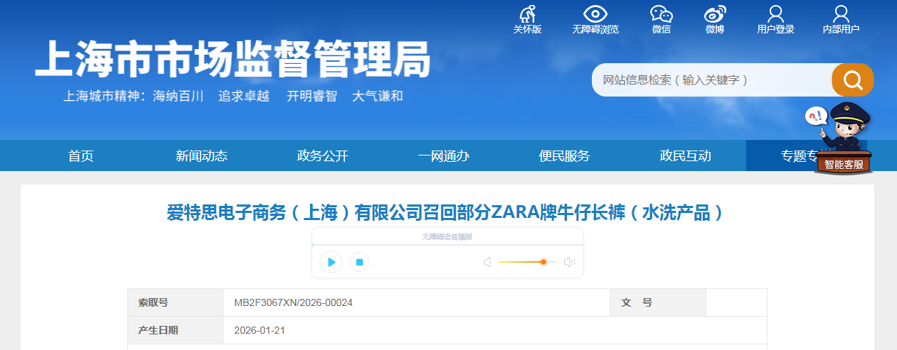 愛特思電子商務(wù)(上海)有限公司召回部分ZARA牌牛仔長褲(水洗產(chǎn)品)