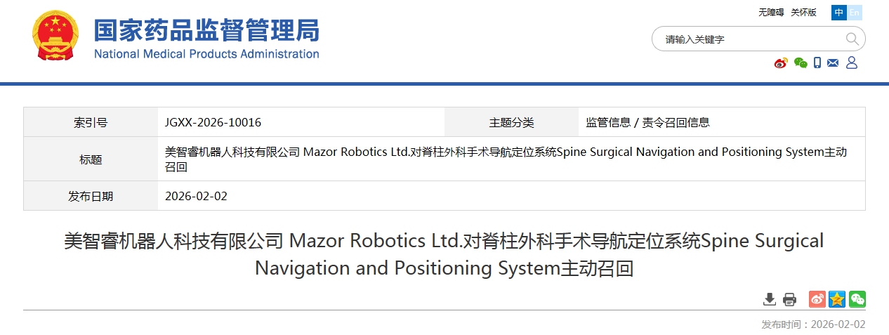 美智睿機(jī)器人科技有限公司 Mazor Robotics Ltd.對脊柱外科手術(shù)導(dǎo)航定位系統(tǒng)Spine Surgical Navigation and Positioning System主動(dòng)召回美敦力(上海)管理有限公司報(bào)告,由于軟件版本5.1.1中存在兩項(xiàng)軟件異常,可能導(dǎo)致屏幕實(shí)時(shí)顯示延遲,或?qū)Ш街新葆斉c屏幕上顯示的螺釘信息不一致等問題,生產(chǎn)商美智睿機(jī)器人科技有限公司 Mazor Robotics Ltd.對其生產(chǎn)的脊柱外科手術(shù)導(dǎo)航定位系統(tǒng)Spine Surgical Navigation and Positioning System(國械注進(jìn)20213010107)主動(dòng)召回。召回級別為二級召回。涉及產(chǎn)品的型號、規(guī)格及批次等詳細(xì)信息見《醫(yī)療器械召回事件報(bào)告表》。