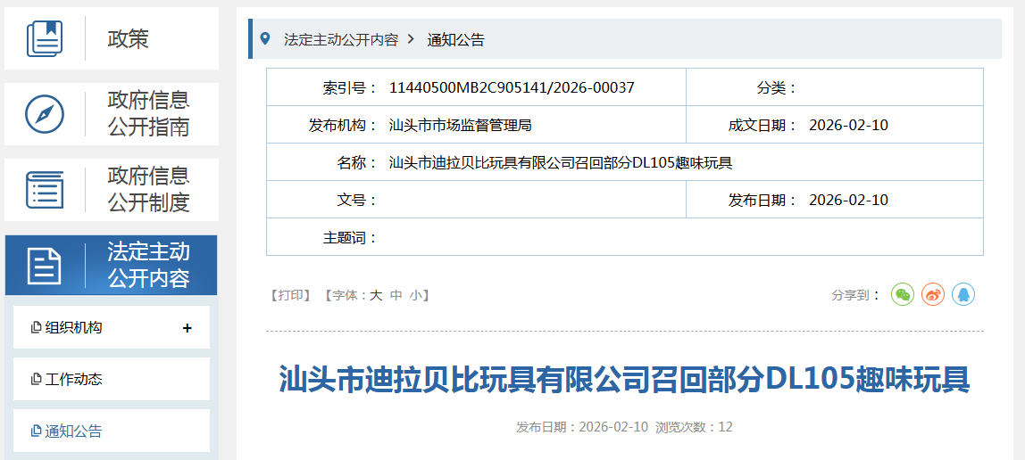 中國質(zhì)量新聞網(wǎng)訊 據(jù)廣東省汕頭市市場監(jiān)督管理局網(wǎng)站消息,日前,汕頭市迪拉貝比玩具有限公司按照《消費品召回管理暫行規(guī)定》的要求,主動向汕頭市市場監(jiān)督管理局報告了召回計劃,將自即日起,召回2025年5月2日至2025年5月5日期間制造的部分趣味玩具,型號:DL105,涉及數(shù)量為160只。