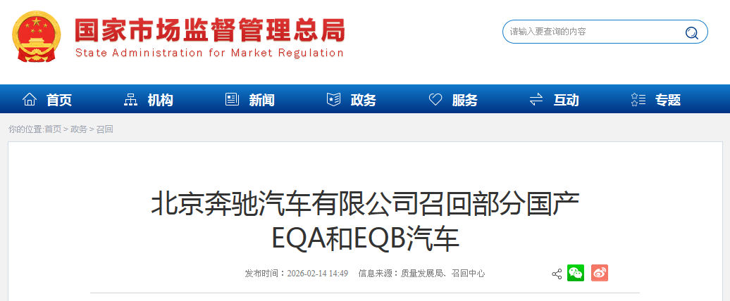 召回編號S2026M0026I:自2026年6月25日起,召回生產日期在2021年4月1日至2024年3月12日期間的部分國產EQA和EQB汽車,共計19481輛。