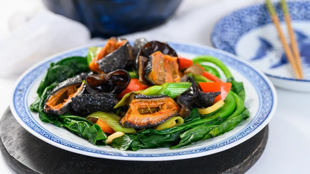 步驟:1. 備好發泡過的海參并切成較大塊。2.備好香菇并切成中等大小的塊狀。3.放入姜蒜爆香。4.加入韭菜和香菇。5.倒入雞湯將所有味道鎖在一起。6. 煮至沸騰,加入鹽,糖和蠔油。7.再煮一分鐘,并確保所有的調味料在醬汁中混合均勻。8.加幾滴香油。9.關火,將水淀粉倒入鍋中,然后加入海參。10.再將鍋的溫度調至中火,燒至所有食材都被輕輕附上一層醬料即可。11.出鍋盛盤前,盤底可用卷心萵苣或芥藍菜作為配菜。