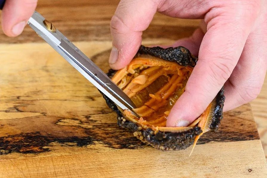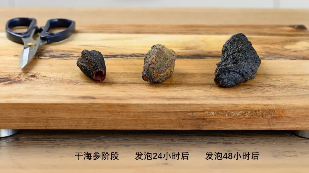 3,注意:如果是泡發整參(筒參),在浸泡24小時后,最好將其取出并切半并切斷其筋以釋放張力,并使其在第二輪24小時的浸泡中得以舒展。如果您買的是已切半的蝴蝶狀的海參,則不必切半。