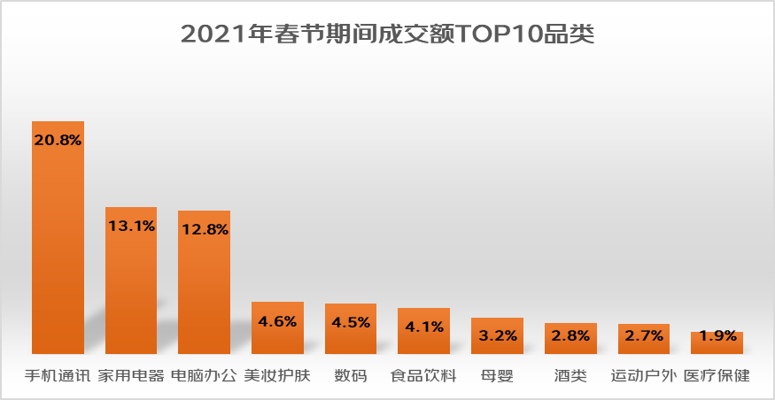 從2013年至2021年春節期間消費者購物品類結構變化趨勢來看,在TOP10成交額品類中,手機通訊、電腦辦公和家用電器等品類成交額占比穩居前三位。從變化來看,美妝護膚、酒類和醫療保健的成交額占比排名上升較多。從品類集中度來看,TOP10品類的成交額占比在2013年達92.4%,2017年降低為82.4%,2021年則為70.6%。