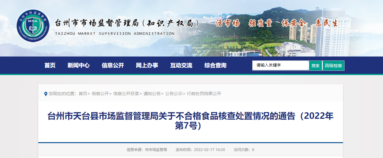臺州市天臺縣市場監督管理局關于不合格食品核查處置情況的通告(2022年第7號)