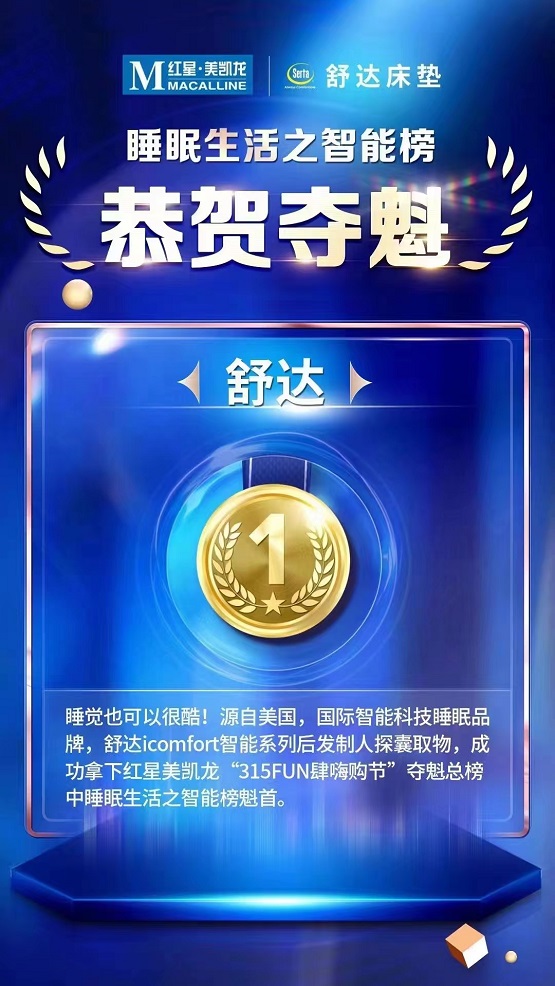 2022年4月6日,紅星美凱龍集團發布“315FUN肆嗨購節奪魁總榜TOP100”,其中舒達iComfort 位居“睡眠生活-智能榜”No.1。該榜單是紅星美凱龍根據2022.2.15-4.5期間取值全國商場數據進行排名。