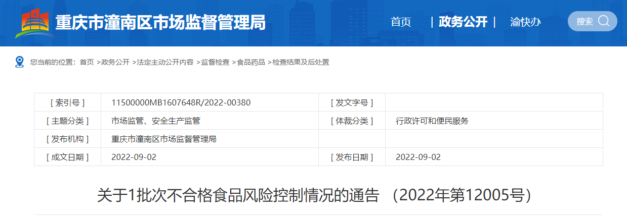 重慶市潼南區(qū)市場監(jiān)督管理局關(guān)于1批次不合格食品風(fēng)險控制情況的通告