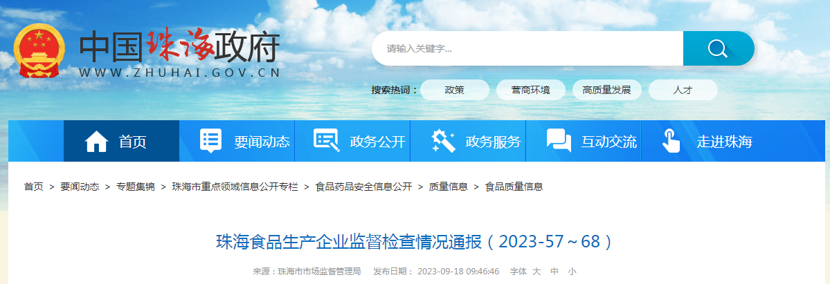 珠海市食品生產企業監督檢查情況通報(2023-57)