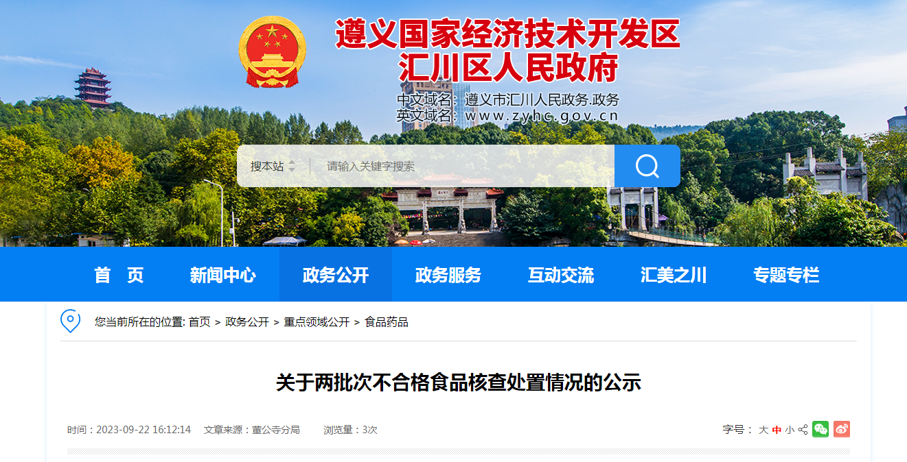中國質量新聞網訊 9月22日,貴州省遵義市匯川區市場監管局公示兩批次不合格食品核查處置情況。