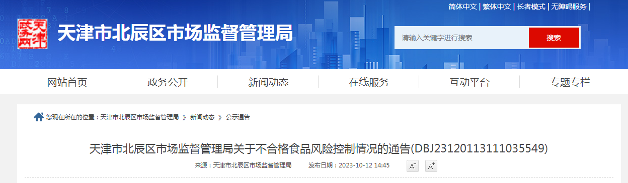 天津市北辰區市場監督管理局關于不合格食品風險控制情況的通告(DBJ23120113111035549)