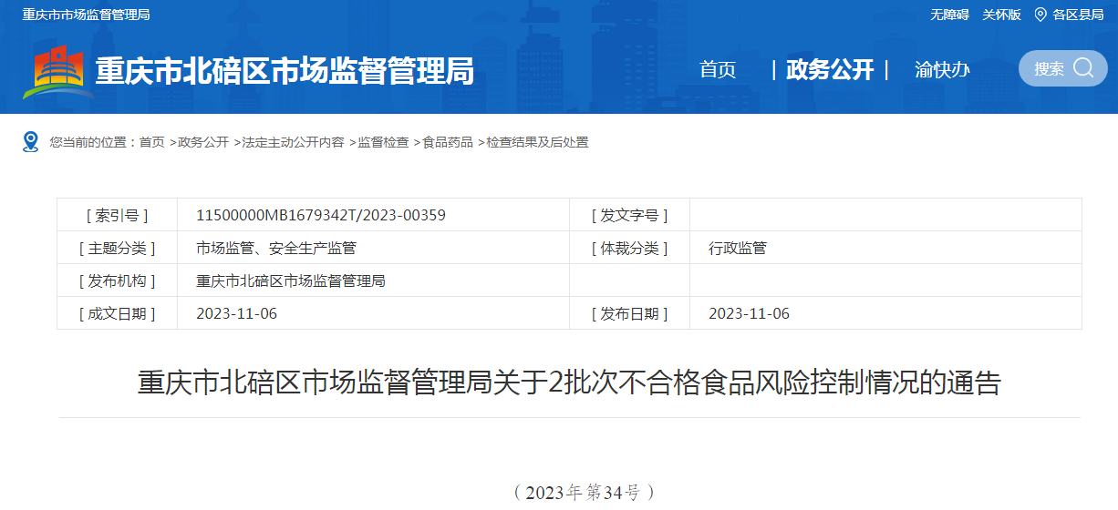 中國質(zhì)量新聞網(wǎng)訊 11月6日,重慶市北碚區(qū)市場監(jiān)督管理局發(fā)布關于2批次不合格食品風險控制情況的通告(2023年第34號)。