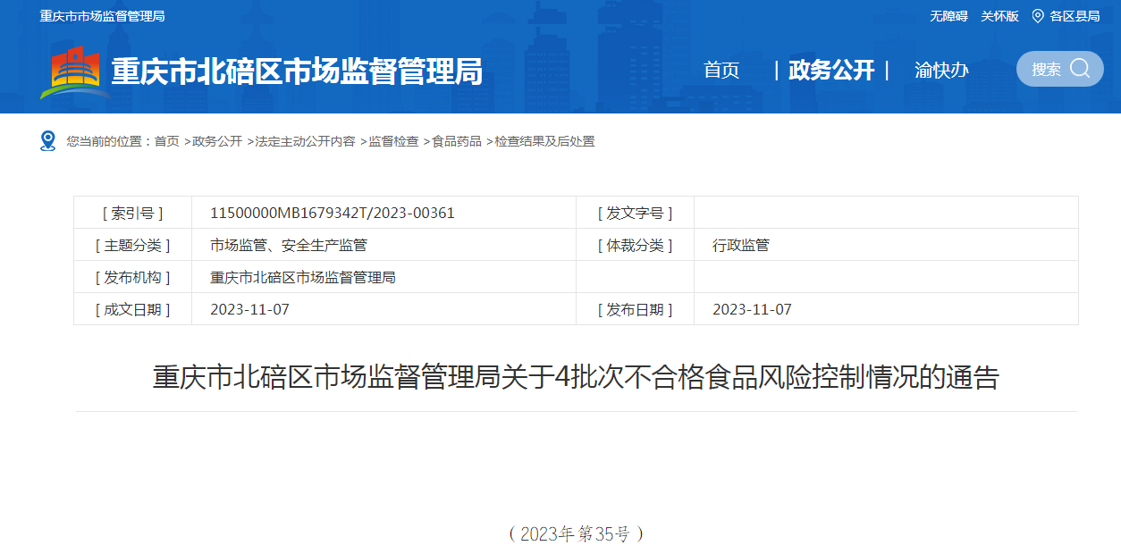 中國質量新聞網訊 11月7日,重慶市北碚區市場監督管理局網站發布關于4批次不合格食品風險控制情況的通告(2023年第35號)。