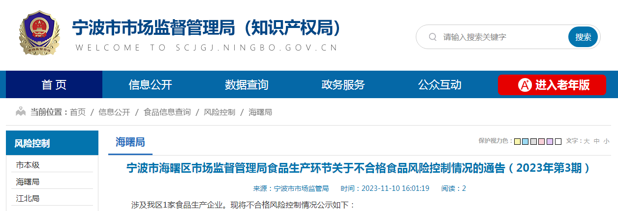 寧波市海曙區(qū)市場監(jiān)督管理局食品生產(chǎn)環(huán)節(jié)關(guān)于不合格食品風(fēng)險(xiǎn)控制情況的通告(2023年第3期)