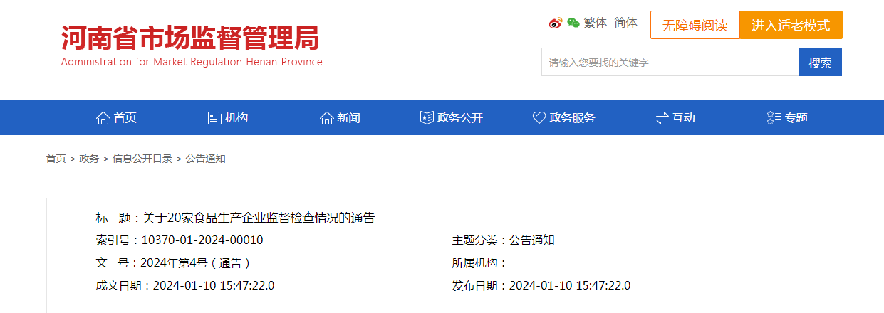 河南省市場監督管理局關于20家食品生產企業監督檢查情況的通告