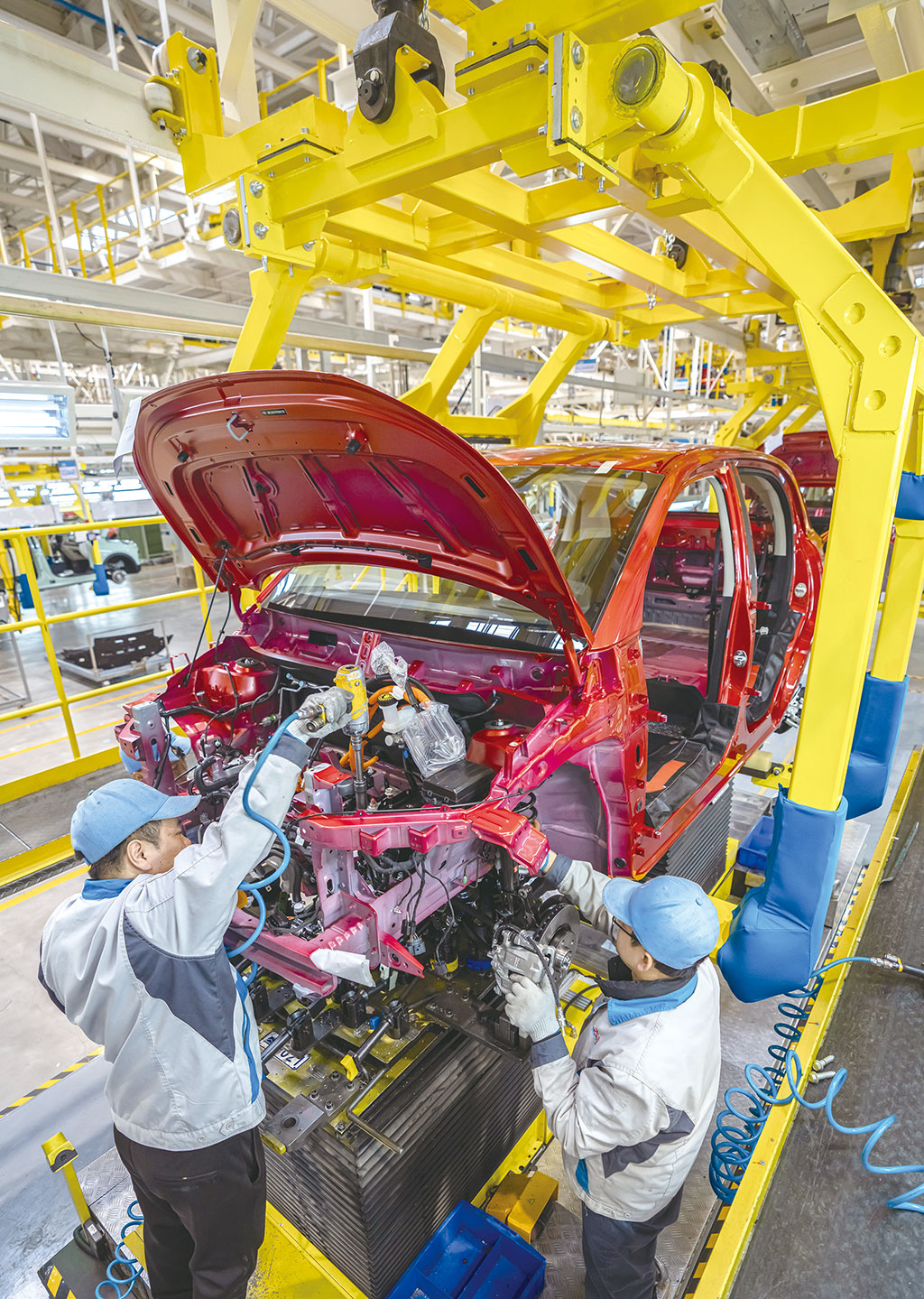 近年來(lái),山西省運(yùn)城市大力發(fā)展新能源汽車產(chǎn)業(yè),打造綠色環(huán)保、智能化的智慧生產(chǎn)線,讓數(shù)字技術(shù)助推產(chǎn)業(yè)升級(jí)。圖為1月25日,技術(shù)工人在運(yùn)城市大運(yùn)新能源汽車總裝車間作業(yè)。 黔 昶 攝