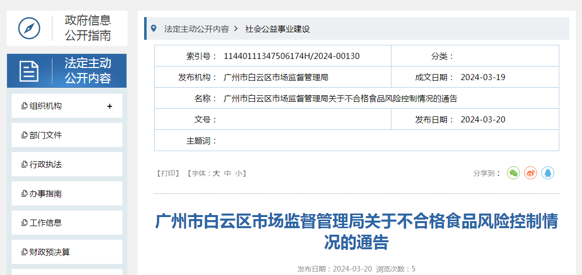 《市場監管總局辦公廳關于對8批次抽檢不合格食品開展核查處置的通知》(市監食檢函〔2023〕437號)涉及我區廣州市鳴發果業有限公司經營的沙糖橘。現將不合格食品風險控制情況通告如下: