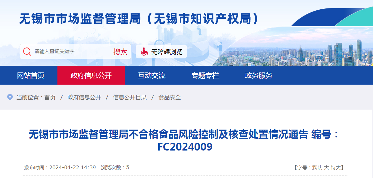 無(wú)錫市市場(chǎng)監(jiān)督管理局不合格食品風(fēng)險(xiǎn)控制及核查處置情況通告