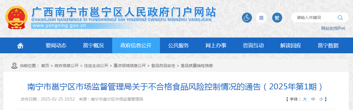 南寧市邕寧區市場監督管理局關于不合格食品風險控制情況的通告(2025年第1期)